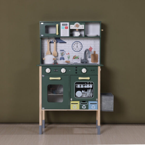 Equipped with a coffee machine for brewing morning pick-me-ups, a cupboard for storing essentials, a kitchen sink for washing up, and a dishwasher for easy clean-up, this set has it all. Plus, with an induction cooker and recycling bin, little ones can learn about sustainability while they play.