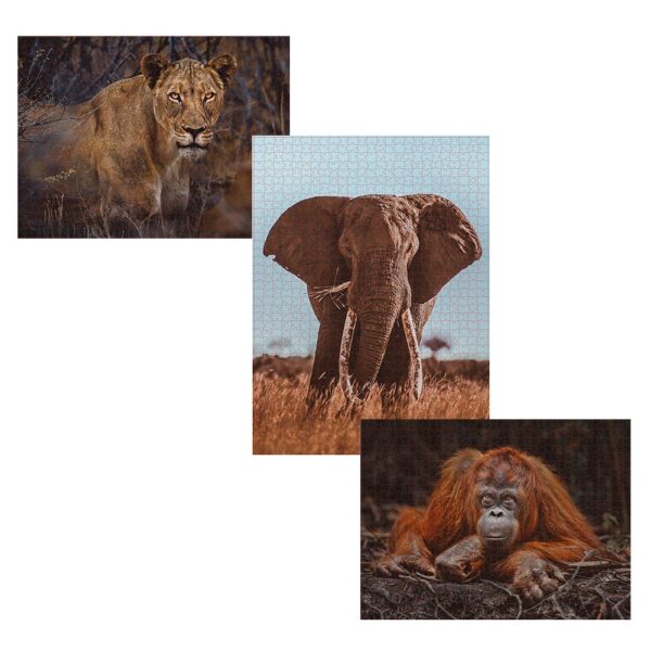 The 3, 1000-piece puzzles included within this bundle feature an elegant elephant, a fierce lioness and a thoughtful orangutan.