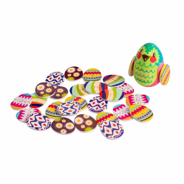 A great addition to your arts and crafts kit, these colourfully patterned egg-shaped wood buttons can be used for craft and collage activities and can be glued or sewn on to fabric and card.