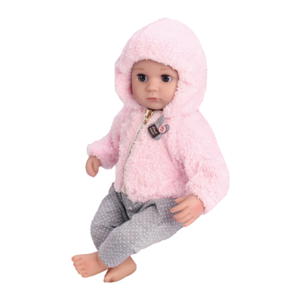 This 40cm baby doll features a soft cotton body, providing a cuddly feel while its vinyl head, hands, and feet offer a lifelike touch. Dressed in a cute outfit with a beanie, body suit, and diaper, this doll is perfect for nurturing play.