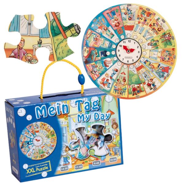 This 49 piece puzzle accompanies children through their daily activities and makes a preliminary approach to telling the time in a play context.