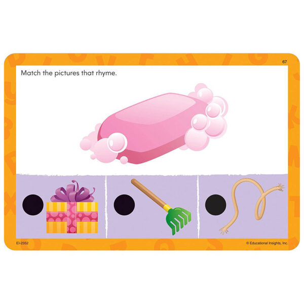 Getting ready for school has never been this fun! Set of 72 beginning phonics activities on 36 double-sided cards teach children all they need for success including initial & final sounds and rhyming words.