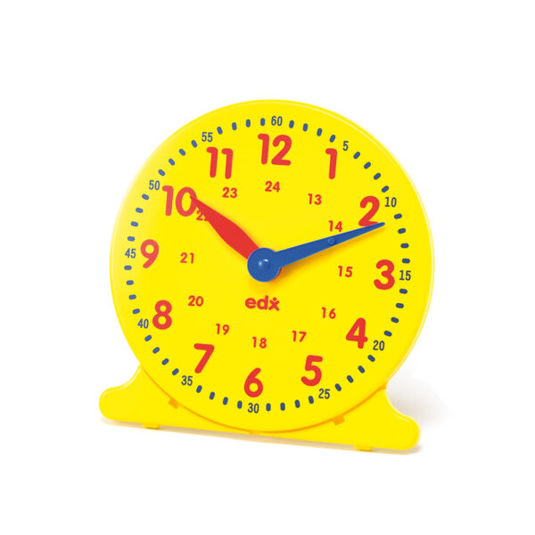 Made of durable moulded plastic with colour coded geared hour and minute hands. Large 12 hour markings make it easy for the student or teacher to demonstrate time telling. Both the Demo and the Student clocks have built in stands for desktop use.