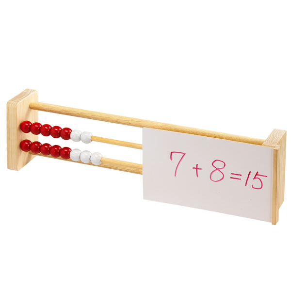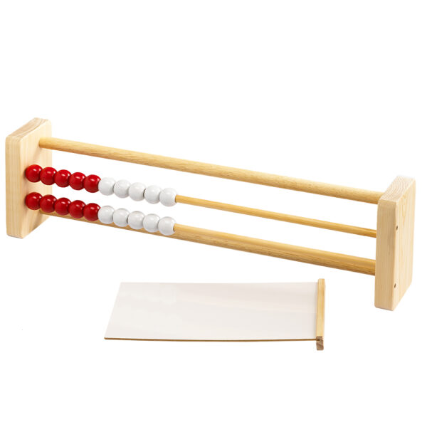 This abacus features two rows of ten beads that easily slide back and forth on wooden rods. Each row comprises of 5 red and 5 white beads.