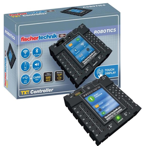 The compact Robotics TXT Controller (90 x 90 x 25mm) can be controlled easily with the colour 2.4″ touch display. The combined Bluetooth/WiFi RF module provides the perfect, wireless interface for numerous applications. The numerous interfaces also include a USB host port for USB sticks and other components such as the fischertechnik USB camera. The integrated Micro SD card slot allows expansion of the memory capacity. 2 Controllers can be coupled.