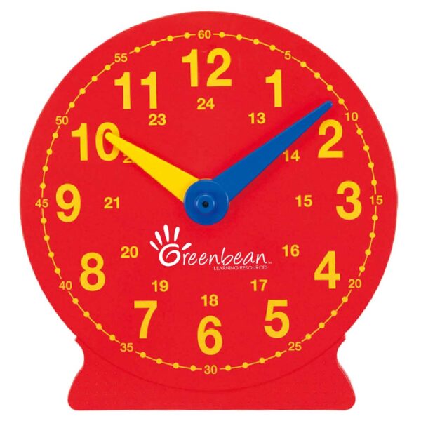 The two hands are geared to function as a real clock when the knob is turned. Simple to use and easy to read.