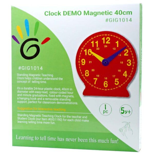 Made of strong, durable and non-toxic plastic, this clock is 40cm (Dia.) and indicates 24 hours and 60 minutes with both number and graduations.