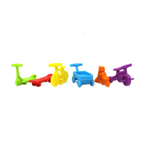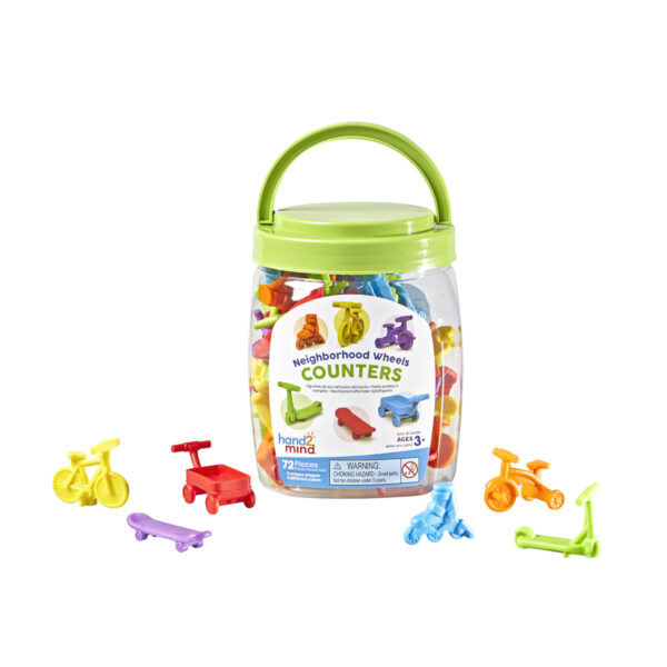 This set of 72 brightly coloured maths counters are ideal for a variety of early years maths activities including counting, grouping, patterning, sorting, adding, subtracting, and more. The set’s scooter, bike, roller, skate, tricycle, skateboard, and wagon counters each come in 6 different fun colours. The Neighbourhood Wheels Counters are made from durable, tactile plastic and are easy for little hands to hold, and for teachers to clean and store. Once the learning fun is done, the counters store in the included plastic tub.