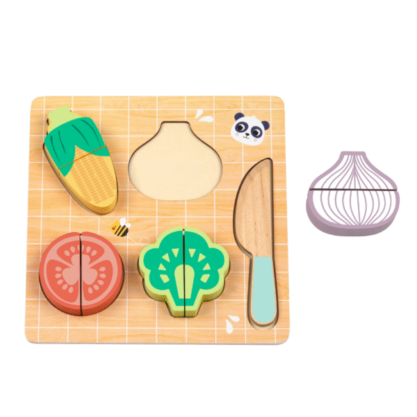 Encourage imaginative play and hands-on learning with this Wooden Vegetable Cutting Puzzle. Designed to enhance fine motor skills, this engaging puzzle features a wooden board with a charming grid pattern, decorated with playful illustrations of a panda face and a bee. It includes realistic wooden vegetable pieces—corn, garlic, tomato, and broccoli—each split into two halves for interactive cutting. Using the child-friendly wooden knife with a light blue handle, kids can practice slicing the vegetables, which fit snugly into designated slots on the board. A fun and educational toy that introduces young learners to healthy foods while improving coordination and problem-solving skills!