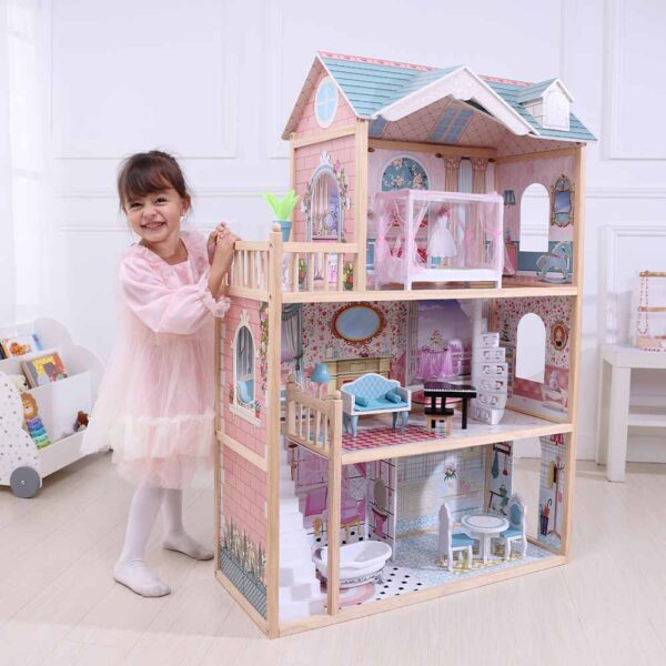 The exterior of the dollhouse is a sight to behold, with a vibrant and inviting façade. Greeted by a spacious and beautiful interior, the main living area can be arranged with furniture, allowing children to create their own cozy living room, dining area, or even a play space for their dolls. There’s plenty of room for creative storytelling and role-playing. A well-appointed bedroom and bathroom provide the perfect setting for pretend play. All storeys offer additional rooms to explore.