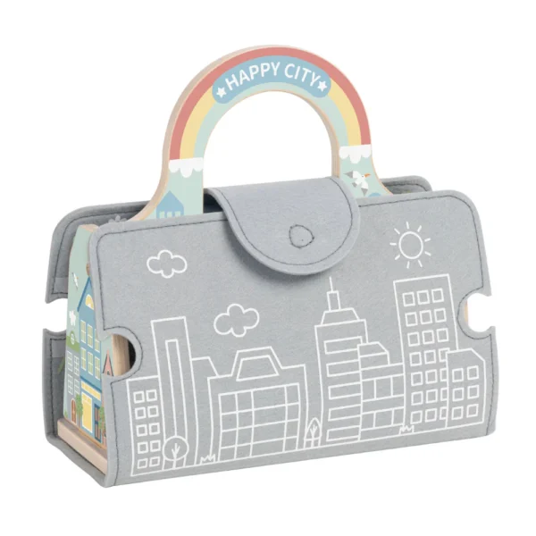 Pack your bags – we’re off to the city! This innovative felt city playset transforms from a carry bag into a complete urban adventure. The bag unfolds to create a soft road surface, while the interior structure becomes a bridge with the wooden handle and sides forming the play framework.