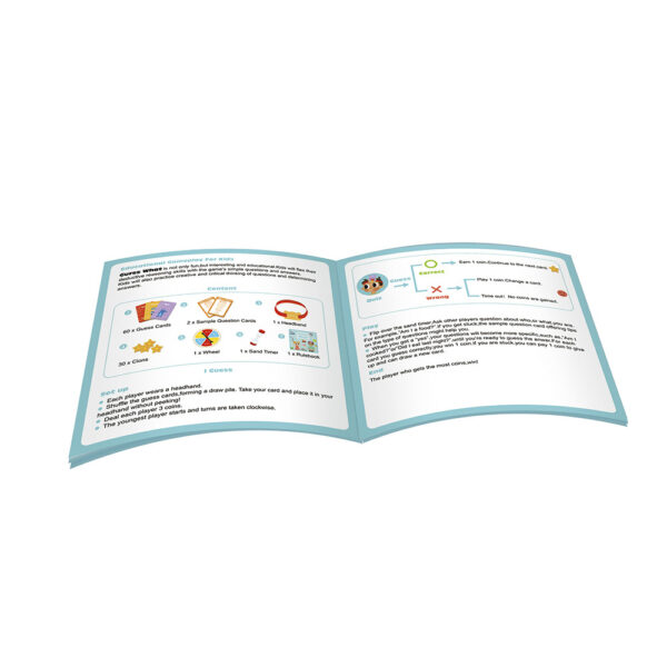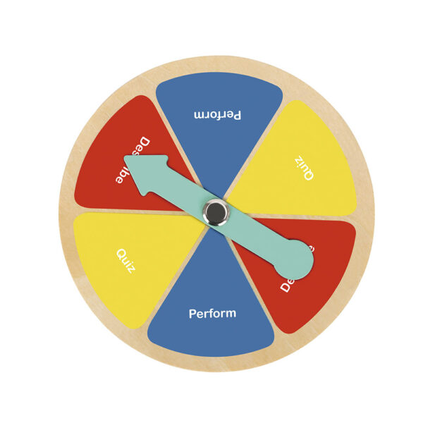 One player puts on the headband and then closes their eyes to select a card from the pile. Let the other player fix it to your headband. Spin the wheel to decipher as to whether you must perform, describe or follow a quiz format to find out the answer featured on the chosen card.