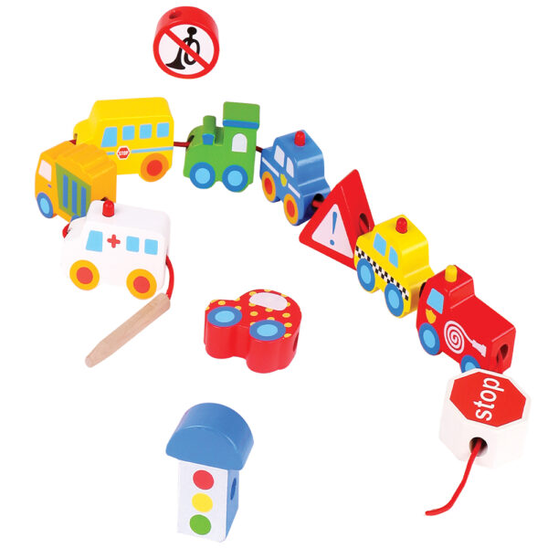These wooden transport-themed lacing beads from TookyToy help build fine motor skills and mode of transport recognition, which are vital for early childhood development.