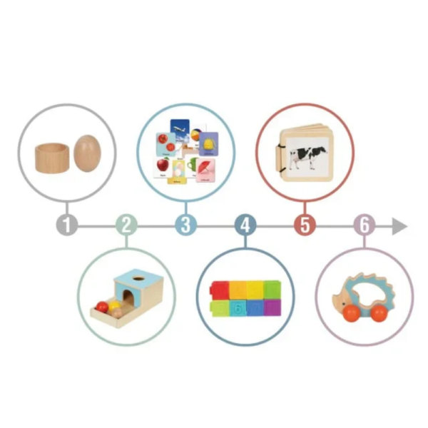 This Montessori play box supports growing curiosity during a key developmental stage. Activities focus on sensory play, object permanence, and fine motor exploration, helping babies understand their environment through hands-on discovery.